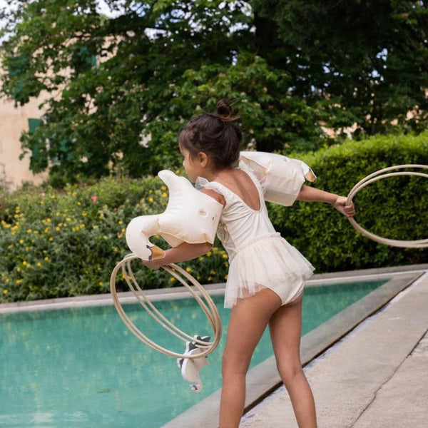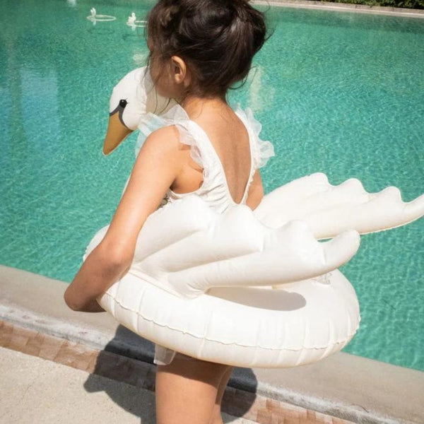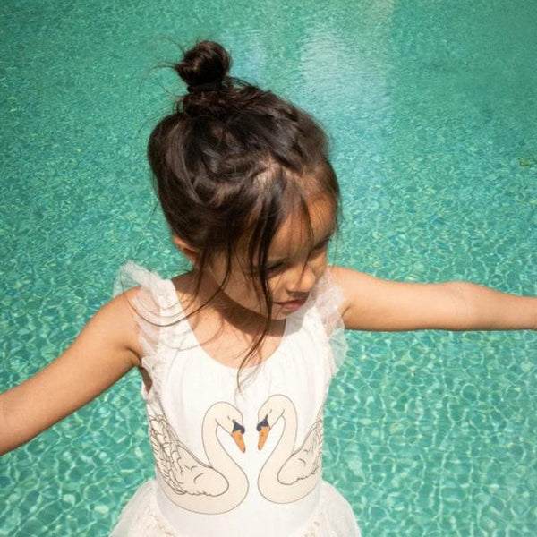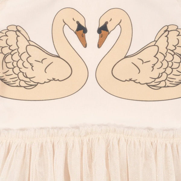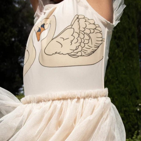 Swimsuit with tulle skirt and tulle detailing on shoulders.