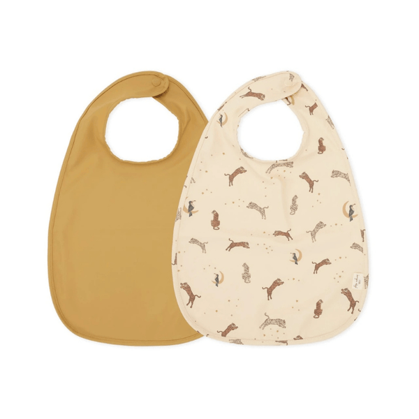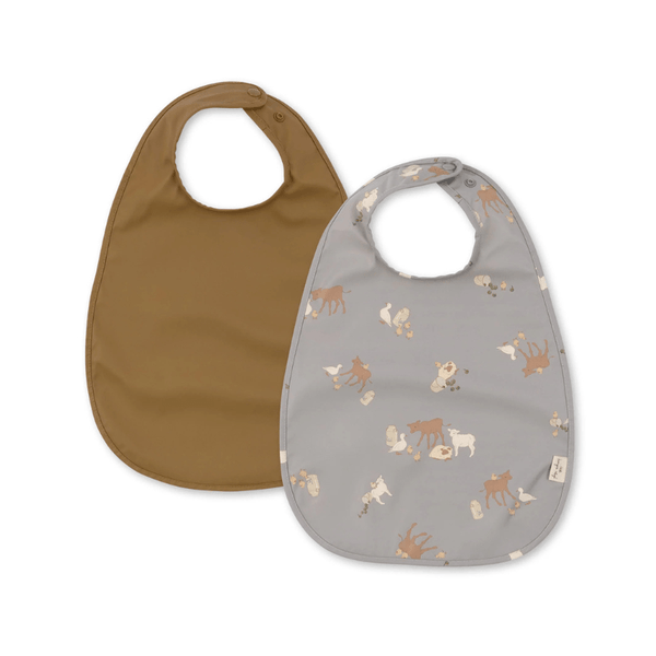 The dinner bib comes in a 2-pack in different prints and colors.