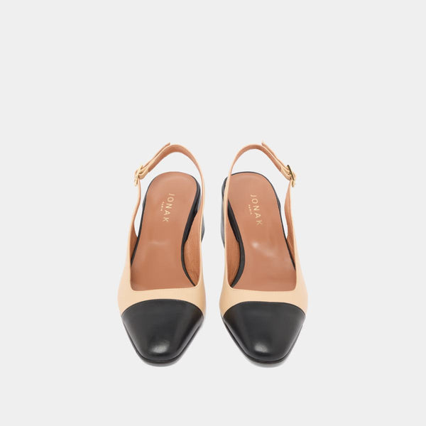 Our new Dhapon heeled slingbacks in black and beige leather will enhance your feet using their delicate adjustable bridles and their play of colors, bringing vintage and modernity.Leave the slight 5 cm heels pruning your silhouette with ease and comfort.