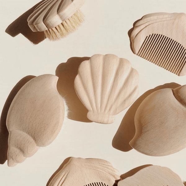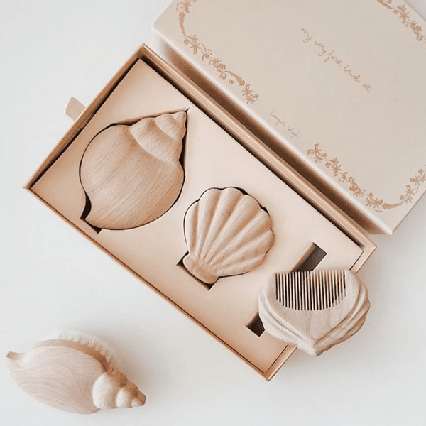 Discover a nice set of Konges Slojd brushes and combs, all in the shape of shells. These rounded shapes allow both a good grip and a mini size. The set is composed of a hairbrush, to brush the delicate hair of the smallest, a nail brush and a comb. The comb and brushes are made of natural wood. We love this little set very practical for baby's grooming.