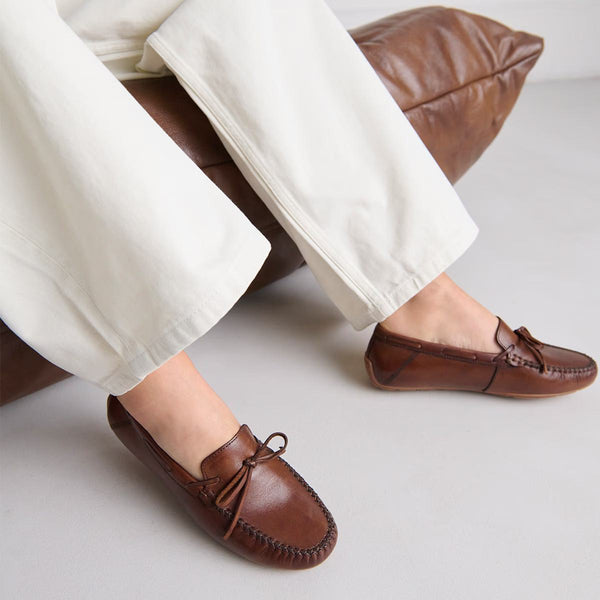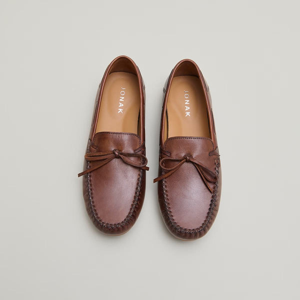 Our moccasins frozen with Angelique Laces in Cognac leather combine contemporary style and comfort.Their warm and elegant shade is easily harmonized with all your sets, whether relaxed or sophisticated.They sport a delicate frowned design at the front, enhanced by solid laces which add a note of distinction.
