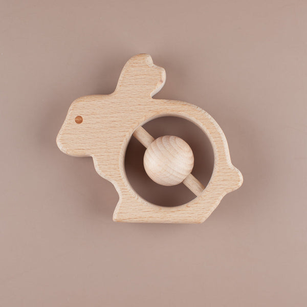 - Bunny wooden teether toy made from 100% natural beech wood. The little rattle in the center to keep your little one entertained. The teether is great to stimulate the development of baby's senses and for soothing their gums.