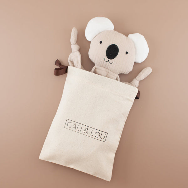 - Soft, natural and eco-friendly beige koala cuddle comforter, which is made from 100% organic cotton muslin. The cuddle comforter comes with a drawstring bag which makes it easy to take it with you everywhere you go!