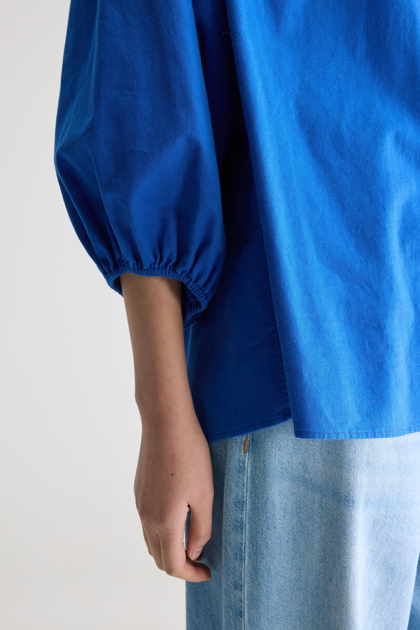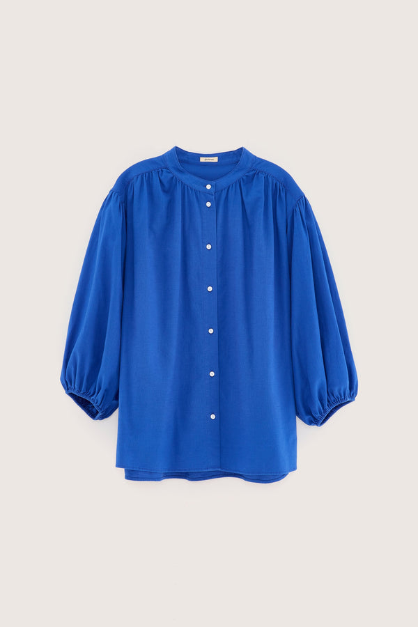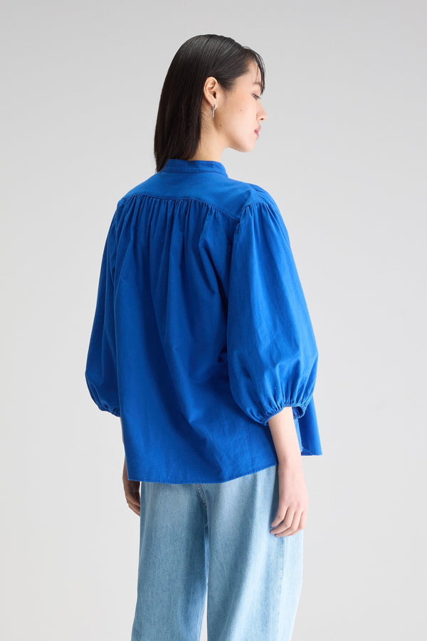 Regular button-up blouse with balloon sleeves and gathered details, made from a cotton and linen blend in lazuli blue.