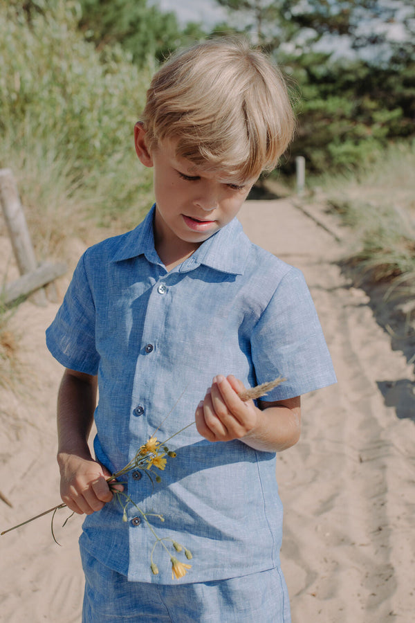 The most breathable linen shirt in blue for boys is the best choice during the summer season! This breathable fabricsand extra comfortable boys linen shirt with short sleeves can be worn during summer and cooler months. MiliMilu offers sophisticated and efficient fashion that guarantees both comfort and confidence. Complete the look by pairing this boys blue linen shirt with blue linen shorts for boys linen set. There's also a matching option for moms and sons to enjoy special bonding time together.