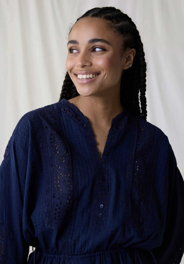 The Roxy Plain dress is the mid-season dress the Leon & Harper woman has been waiting for. With its pretty French-style openwork embroidery and pronounced waist, it highlights a woman's figure beautifully.