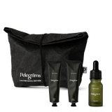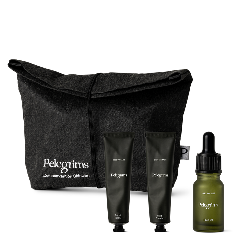 The set includes a 10ml version of our Facial Oil, Facial Balm, and Hand Pomade assembled in a washable kraft paper bag