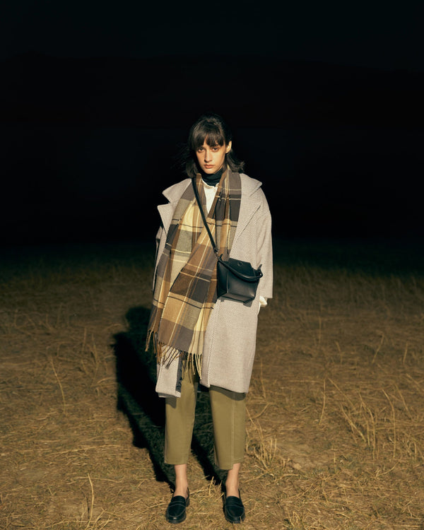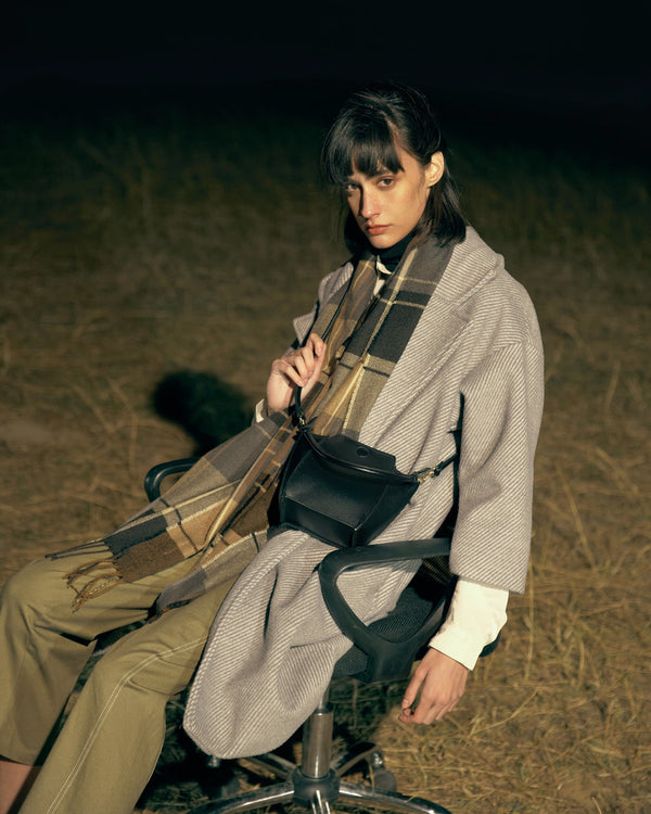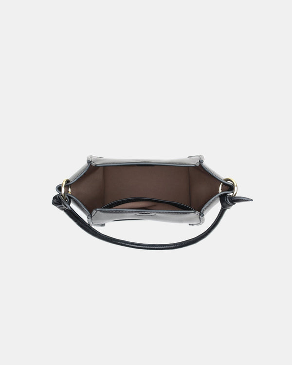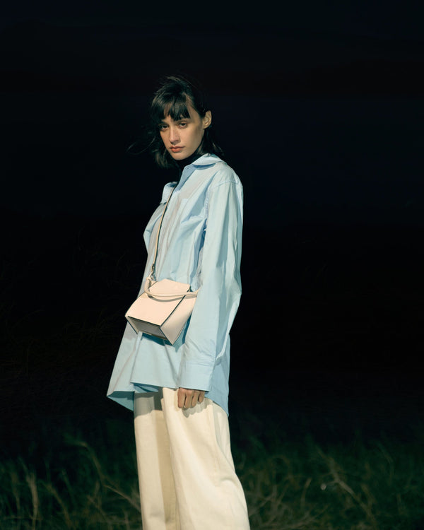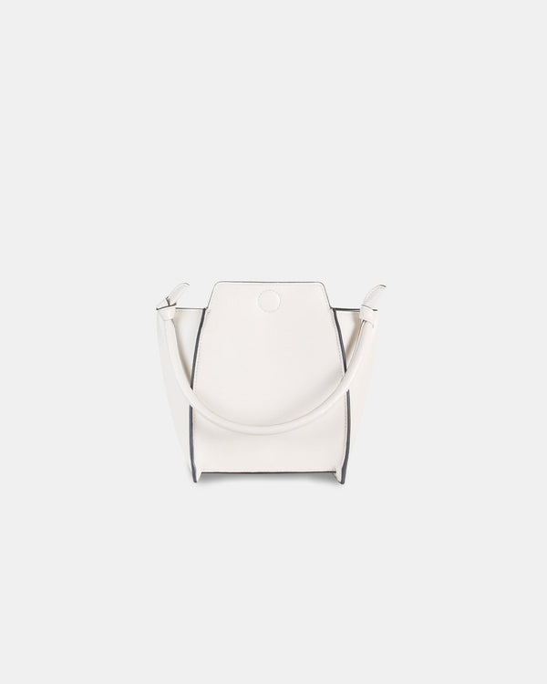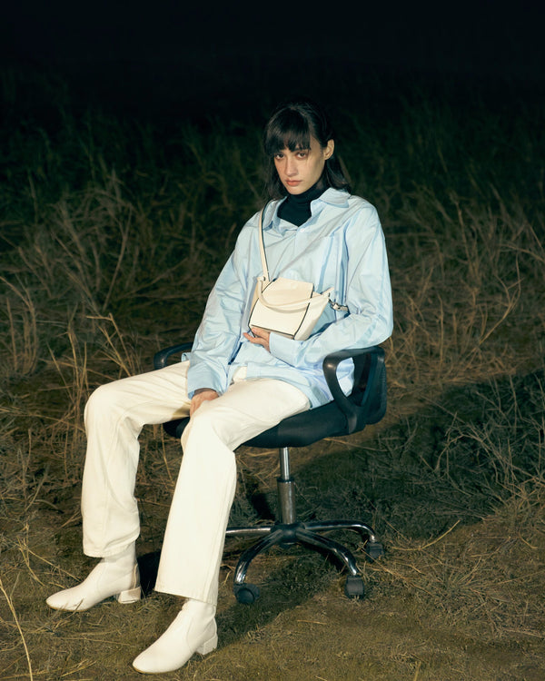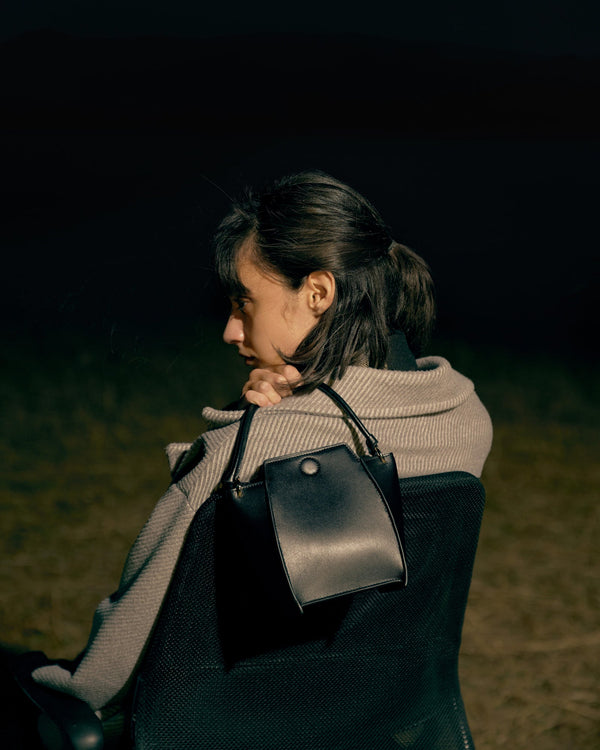 A carton-shaped mini bag. Made with soft vegan microfibre leather, the knotted handle can be laid down or used for handholding the bag. Detachable shoulder strap for styling crossbody.