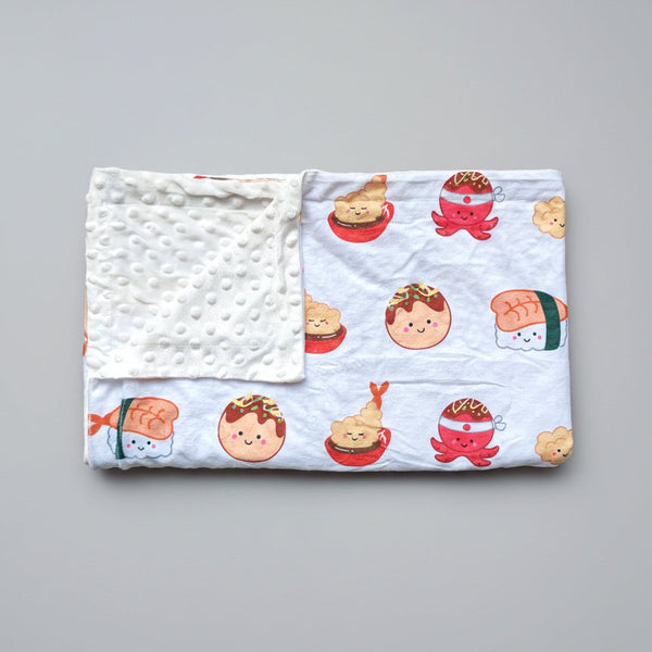 We love street food and at the top of our list is our beloved savory Takoyaki which is made of a flour-based batter and cooked in high heat in a specially molded pan filled with octopus, tempura bits, green onions and topped with a delicious brown and white sauce with bonito shavings. Now you can be transported to Japan too with these delicious octopus balls and crispy shrimp tempura in our super soft sensory blanket!