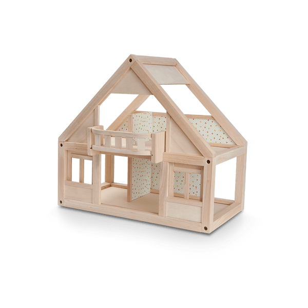 The dollhouses is easily accessible from all sides and consists of a balcony, sliding doors and four rooms which can be furnished as a bedroom, bathroom, living room, kitchen or dining room with our different accessories set (furniture and dolls not included). The rooms feature springtime flower wallpaper.