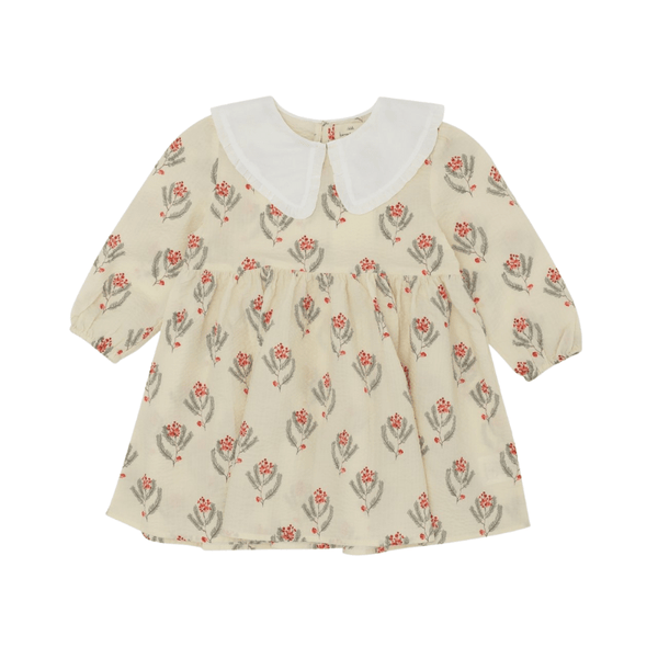 A festive dress in vintage flower print with a pair of lace collar. Closes with a single mother of pearl button in the back. The dress is suitable for welcoming guests, visiting guests and photo shoots.