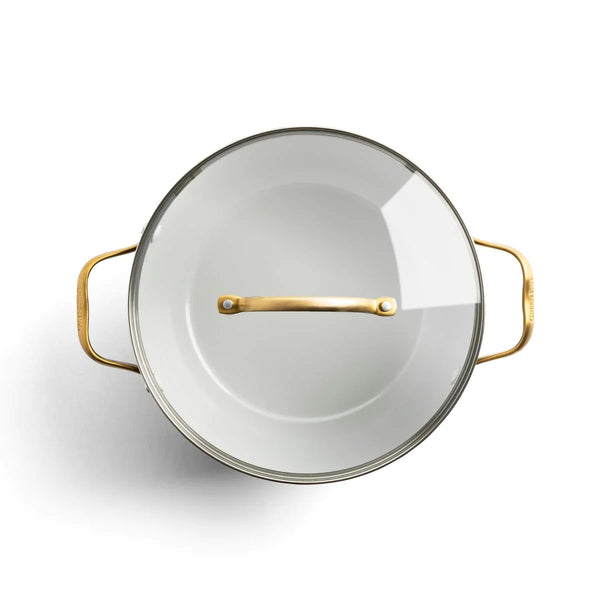 - 深藍色鍋身配以金色不銹鋼手柄,設計高貴
