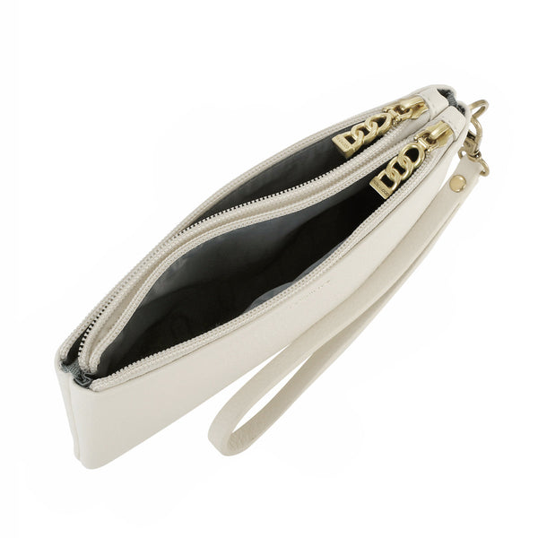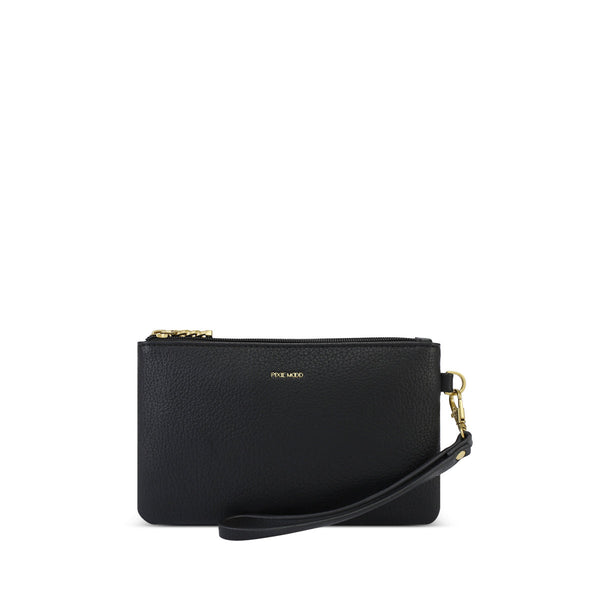 Use this pouch for your daily essentials inside your bag, or use it on it's own as a wristlet - it's entirely up to you and what your day calls for! It's a two compartment pouch with top zips made with soft pebbled vegan leather, and comes with a detachable wrist strap.