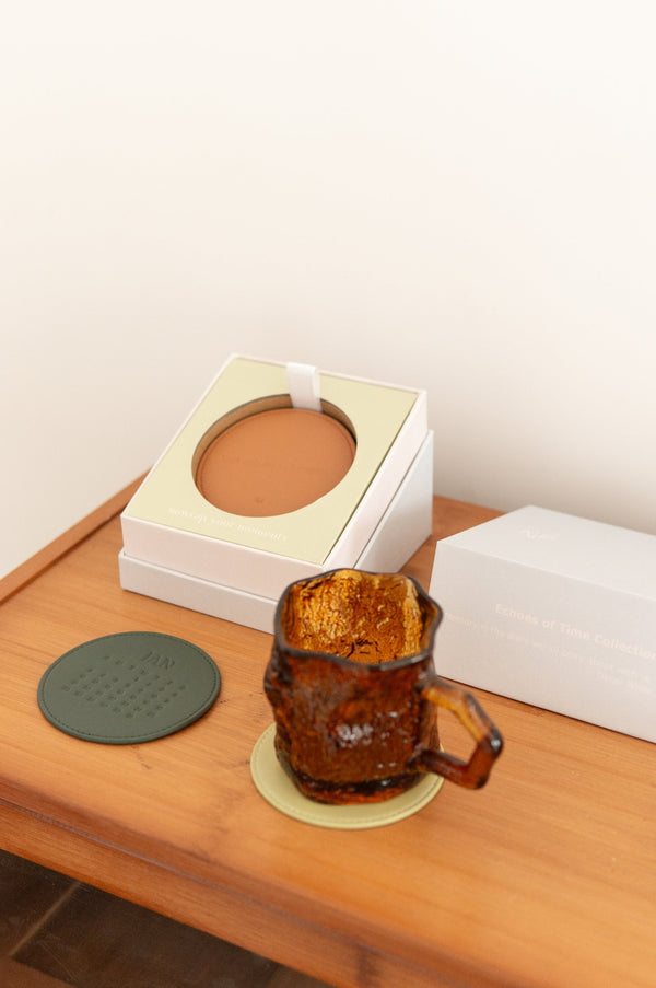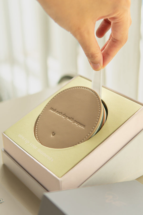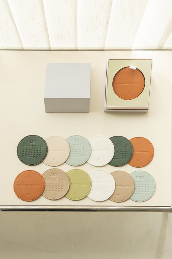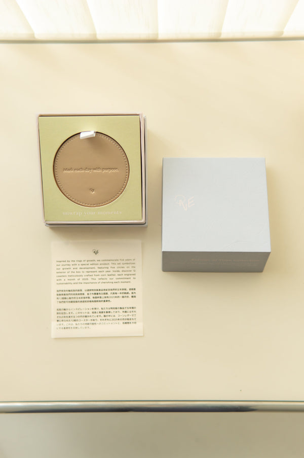 Inspired by the rings of growth, we commemorate five years of our journey with a special edition product. This set symbolizes our growth and development, featuring five circles on the exterior of the box to represent each year. Inside, discover 12 coasters meticulously crafted from corn leather, each engraved with a month of 2025. Each set is one-of-a-kind, with randomly selected colors representing each month of 2025—perfectly blending sustainability with an appreciation for time’s passing.This reflects our commitment to sustainability and the importance of cherishing each moment.