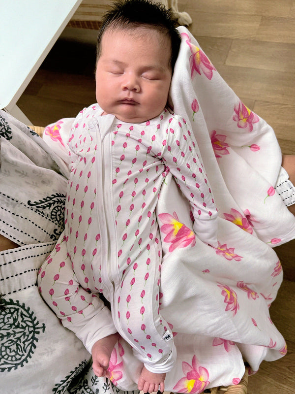 The Enchanted Garden Robe has a small repeat lotus bud watercolor print on one side and a fully bloomed lotus print on the other!