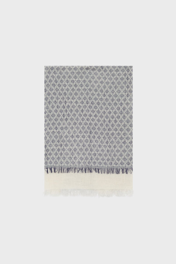 THIS COTTON SCARF HAS A BOHEMIAN CHIC VIBE WITH ITS CRINKLED EFFECT AND BLUE PATTERN ON A WHITE BACKGROUND. ITS SLIGHTLY FRAYED EDGES ENHANCE ITS NATURAL FLAIR.