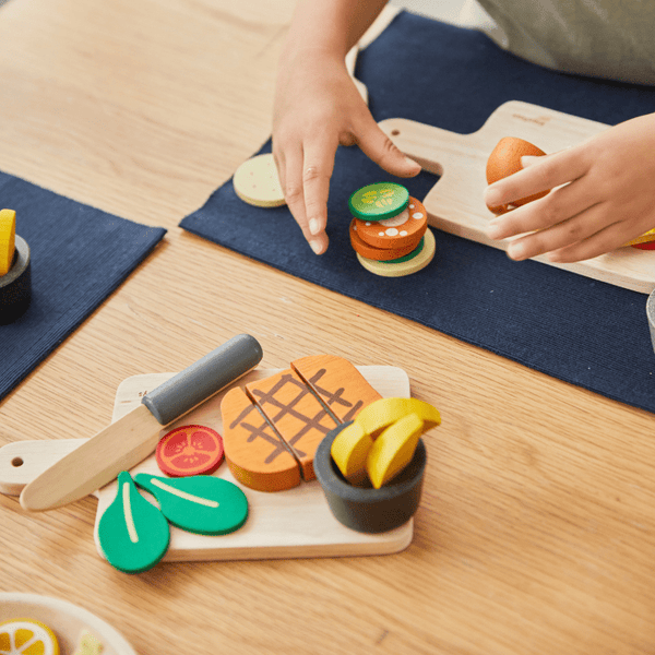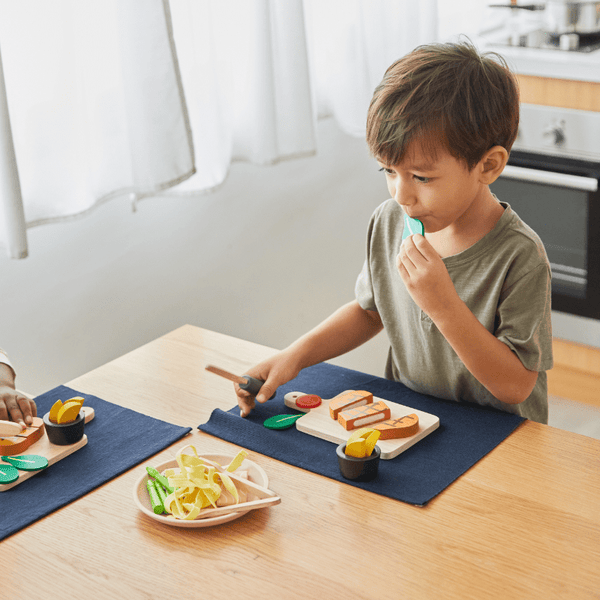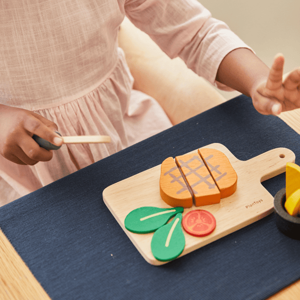 It’s important to teach children the benefits of a well-balanced meal. With this set, children can prepare a western-style steak for themselves or a guest. This set includes 1 halved tomato, 3 potato wedges, 2 slices of lettuce, 1 sauce cup, 1 knife, 1 slab of sliceable beef, and 1 cutting board. Encourage a young chef to develop an extensive menu by combining this set with other PlanToys pretend foods and kitchenware.