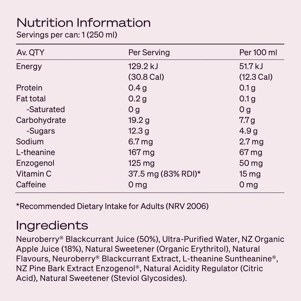 Full Ingredients: Neuroberry Blackcurrant Juice (50%), Ultra-Purified Water, NZ Organic Apple Juice (18%), Natural Sweetener (Organic Erythritol), Natural Flavours, Neuroberry Blackcurrant Extract, L-Theanine Suntheanine, NZ Pine Bark Extract Enzogenol, Natural Acidity Regulator (Citric Acid), Natural Sweetener (Steviol Glycosides)