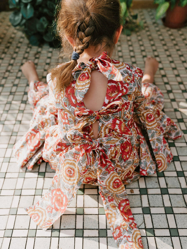 Introducing the Malabar Signature Red Floral Dress, your twinning companion this season! With its vibrant colors and flowy silhouette, you'll instantly feel like a star. This versatile dress allows you to elevate your style by pairing it with elegant ballerina flats, or go for a more casual look with a comfy pair of white sneakers. We've designed it to grow with your little one, featuring adjustable ties for closure. No need to worry about zips or buttons, as we've made it as simple as can be.