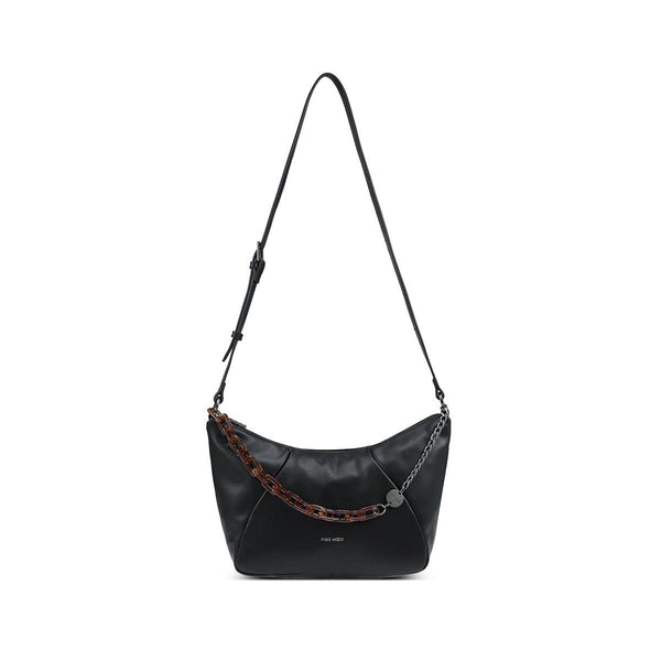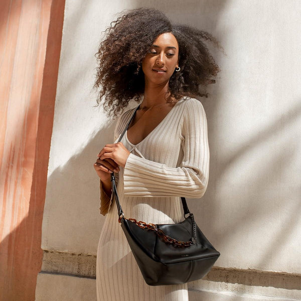 Polished and plush, this bag is designed for versatility. Adjust its strap or remove its decorative vegan tortoise shell chain for interchangeable looks. Sustainably made and lined with our classic recycled bottle lining.