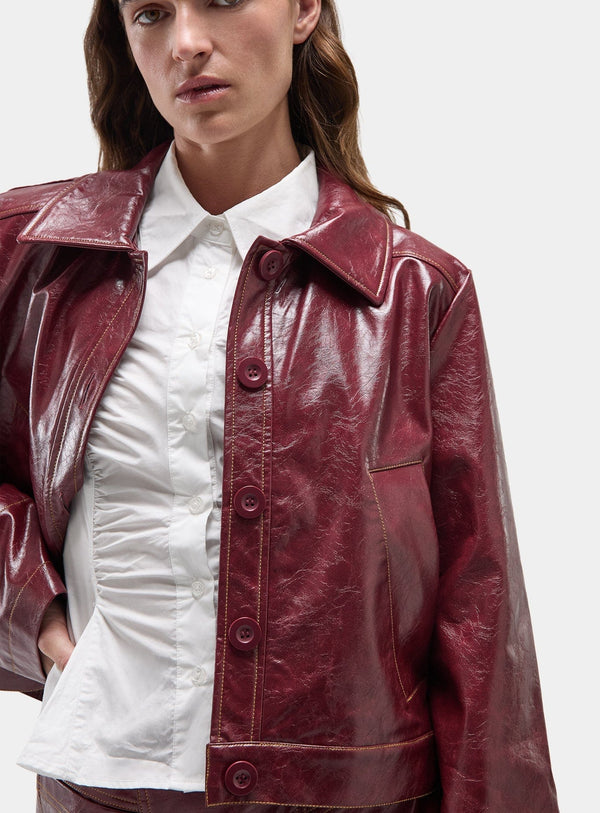 短款纯素皮夹克。翻领,长袖。正面有口袋,正面有纽扣。