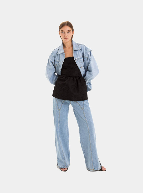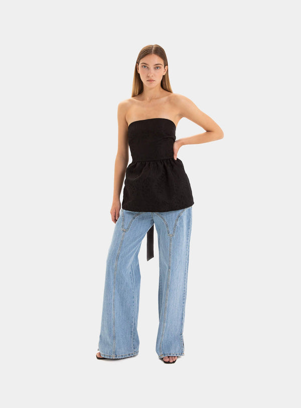 黑色露肩上衣。提花纹理。腰部饰有褶饰,背部带可调节,正面或背面饰有蝴蝶结