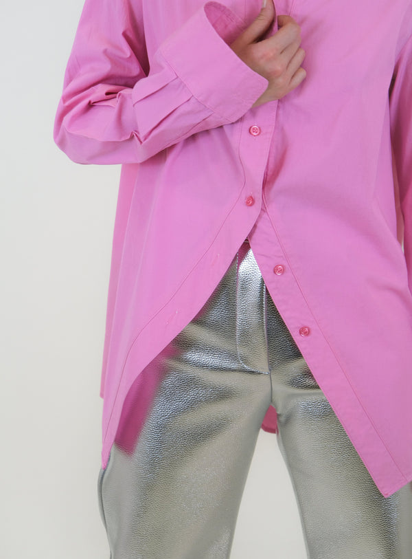 Oversize multi-position pink shirt. Button it up to kill that meeting or undo one extra button to slip it off your shoulders.