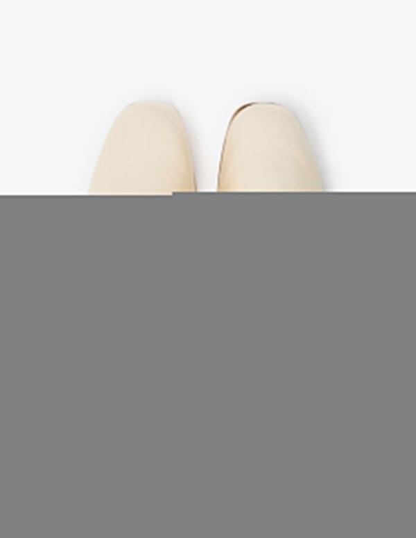 米白色小牛皮芭蕾平底鞋,方头设计,正面褶皱开合。踝部系带,侧面饰有精致的搭扣。加厚皮革鞋垫,磨砂皮革鞋面。