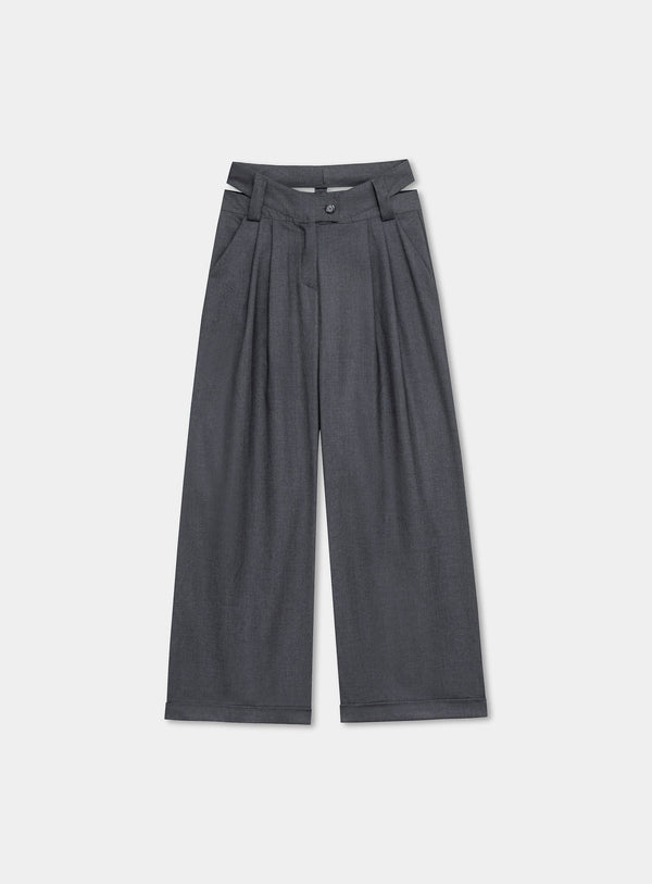 高腰不对称修身裤,双腰带,前部有褶裥。翻边裤脚。两个侧袋。正面内部拉链开合,纽扣闭合。