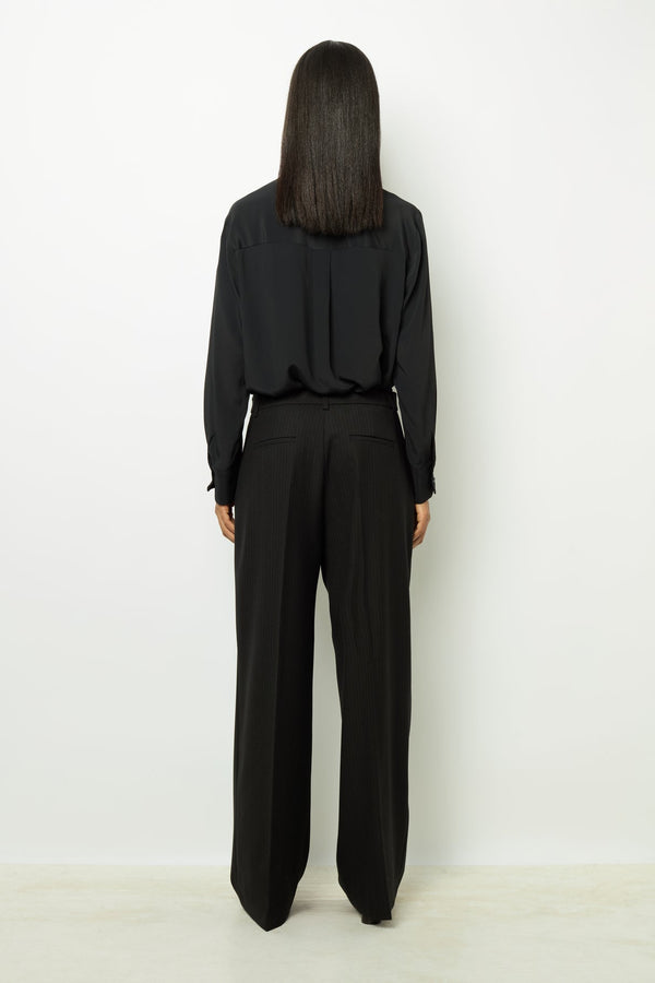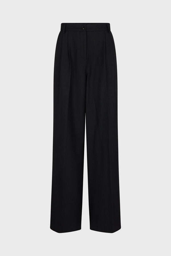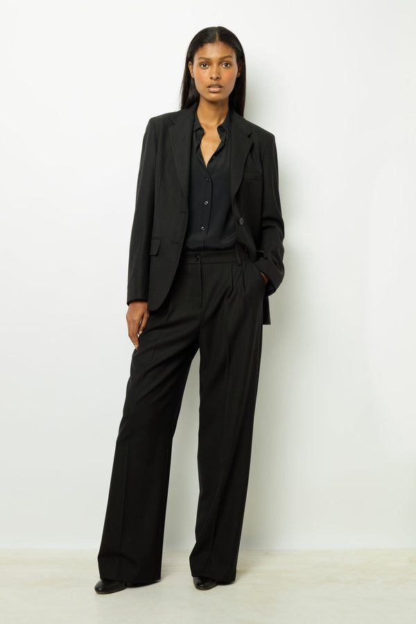 细条纹褶饰阔腿裤。搭配同色系夹克,打造完美造型。