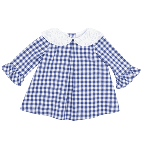 这款蓝色格纹衬衫是返校季或出席特殊场合的首选。宽松剪裁,蕾丝领口和宽松袖口。