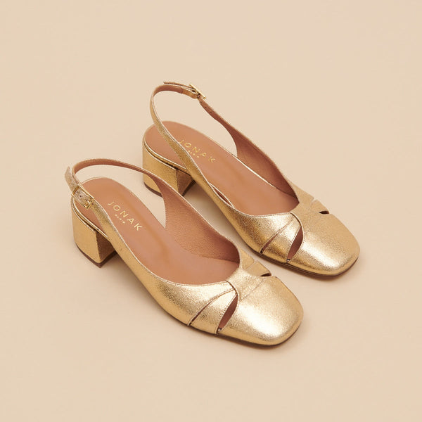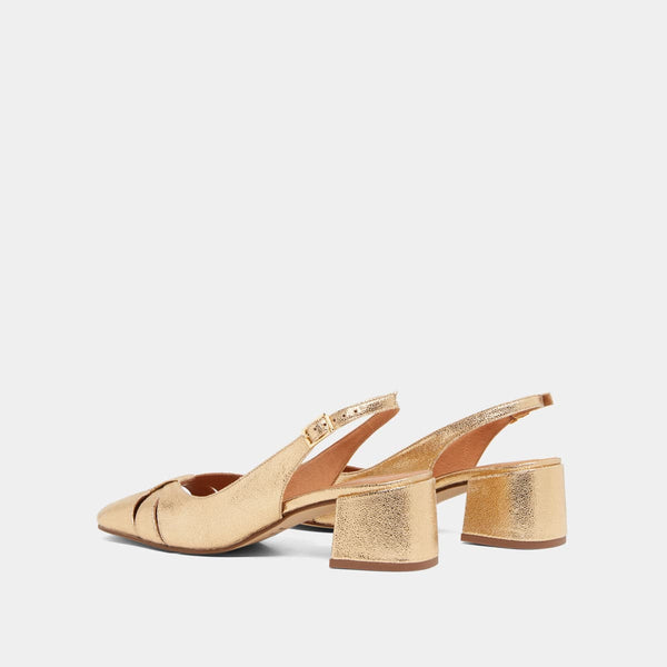 DISTEL ballet flats feature square toes and 5 centimeters heels. The rear toes are open and held in place by an adjustable buckle strap. Crackled leather is a daring choice, giving these babies a unique, shiny look.