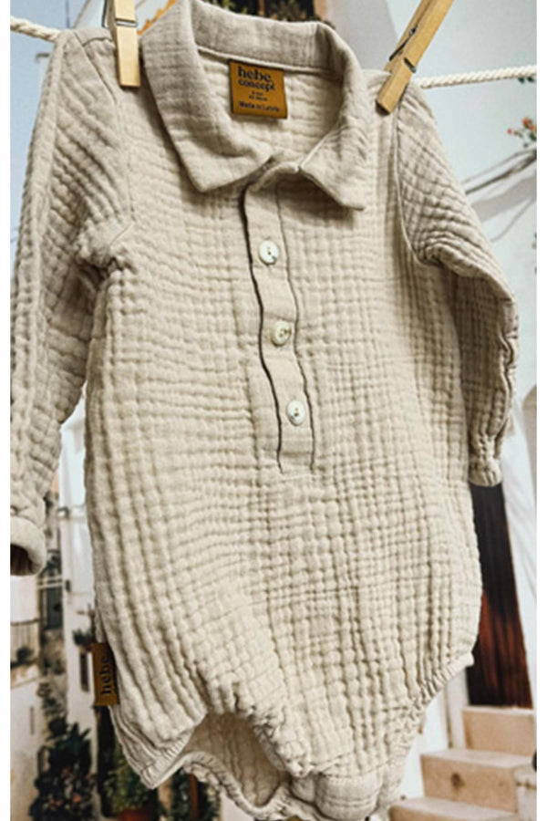 This adorable baby muslin romper combines comfort and simplicity in one effortlessly stylish piece. This baby romper features a relaxed fit, long sleeves, and front buttons, making it ideal for layering in cooler weather or wearing on its own during warm days. Easy snap bottoms ensure fuss-free diaper changes, while the soft light grey color brings a modern, unisex charm to your baby's everyday style with soft collar for that elevated look.
