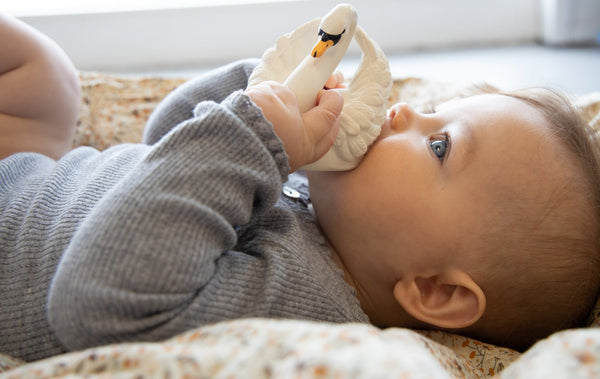Adorable bath toy for sensory play & chewing. Inspired by the national bird of Denmark. It is handcrafted in natural rubber from Sri Lanka, from sustainable forestry. Carefully hand sculpted & hand painted with food grade dyes. Like all Natruba products, this swan is an all natural, eco-friendly, non-toxic (PVC, BPA, Phthalates, and Nitrosamines free) toy, designed with no valve, which means no mold and bacteria can accumulate inside. All Natruba toys are made of natural rubber.