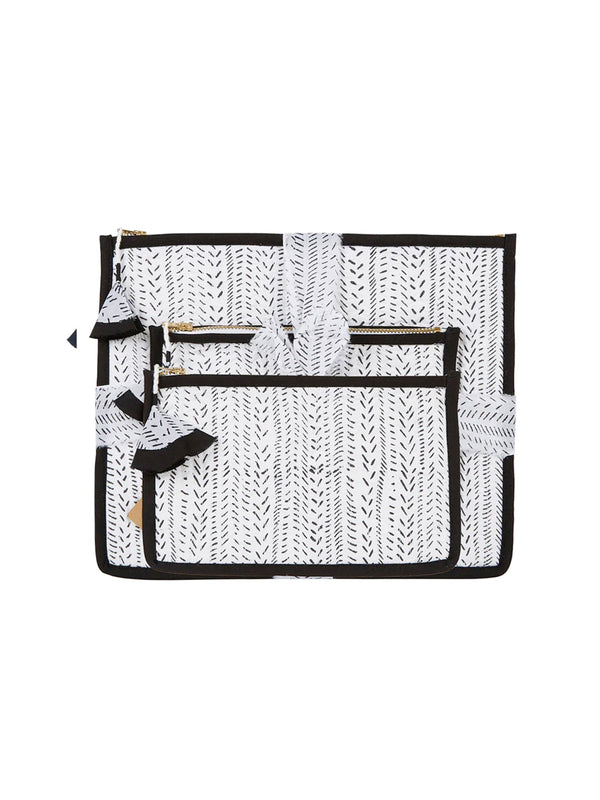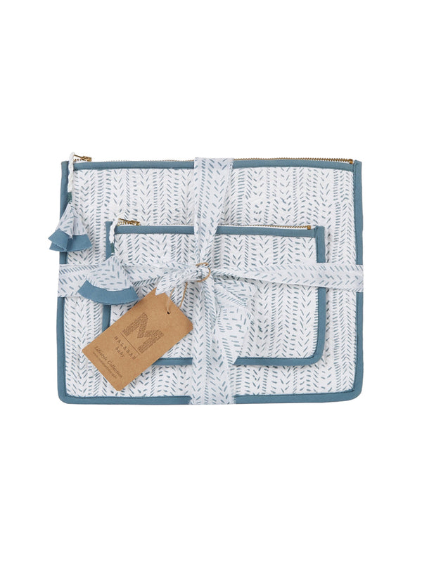 Complementing the robe is our eco-friendly toiletry pouch gift set. Up-cycled from our favorite bedding collections, these toiletry kits are the most stylish and eco-friendly way to organize your tote bag. With two sizes to accommodate various essentials, these pouches are perfect for organizing toiletries, cosmetics, or other small items.