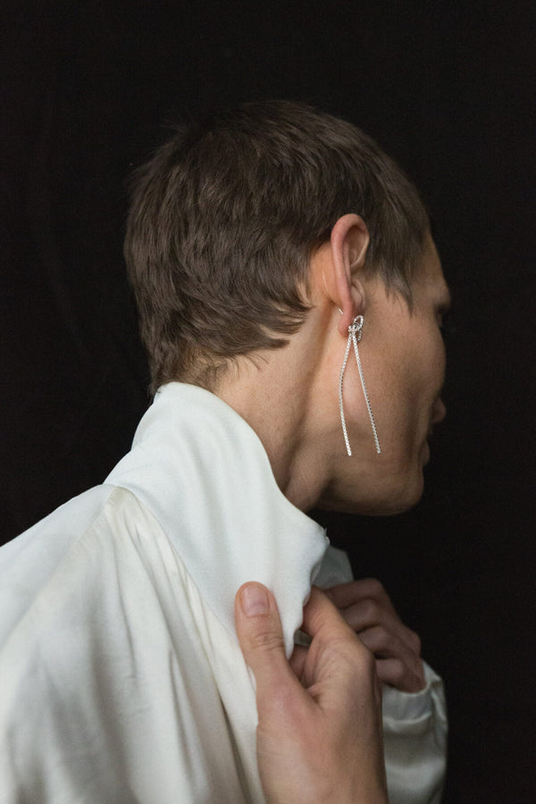 A pair of sparkling, dangling earrings. At the top the chain forms a little bow, its ends are hanging down. Nice for going out. Made in shiny 925 Sterling silver with or without 18 karat gold plating. Made in Munich from recycled silver. Material: 925 sterling silver, with or without gold-plating Measurements: length about 7cm, []