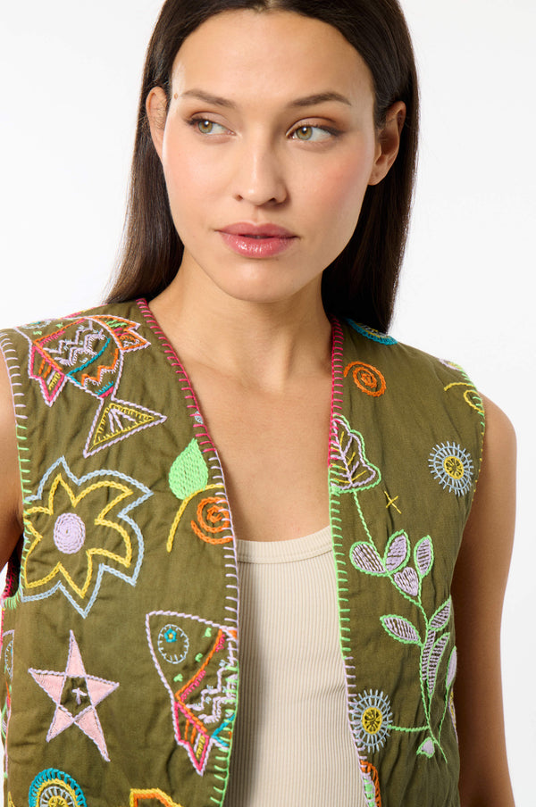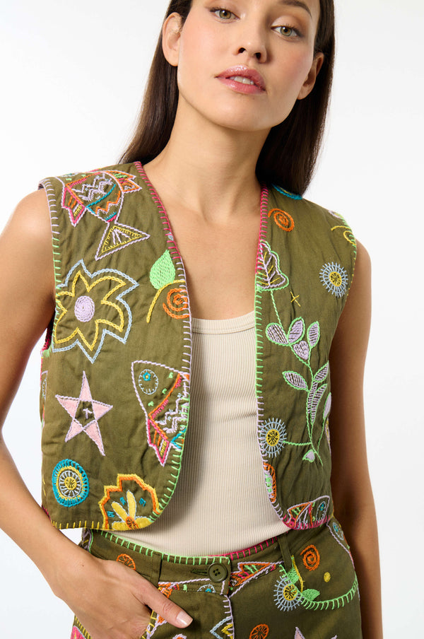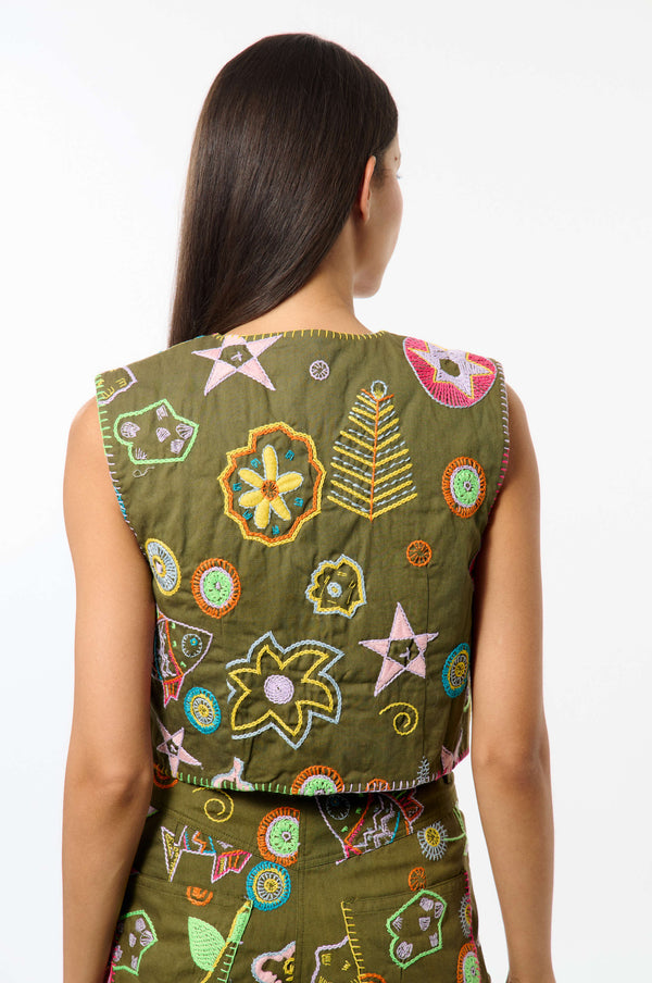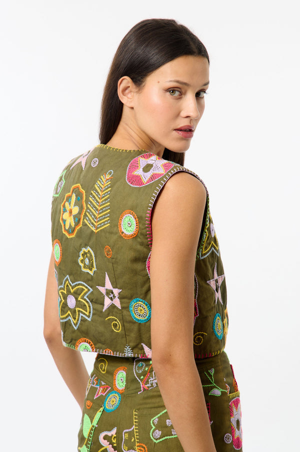 This short sleeveless cardigan is adorned with Mediterranean-inspired embroidery. Its light, airy design evokes a summery, bohemian atmosphere.