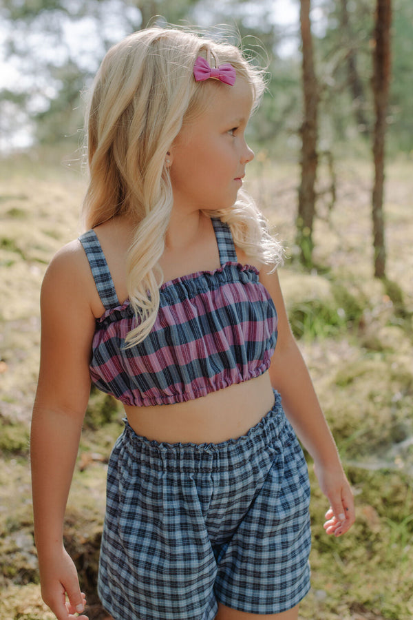 Comfort and style come together with our girl shorts Oti in Bright! These checked blue shorts have an elastic waist and pockets for full comfort and to keep everything handy. They perfectly match a girl crop top; wear them together for a coordinated look! Want to make Mommy and Daughter time even more fun? We also have matching Mommy and Daughter shorts!