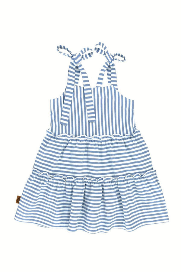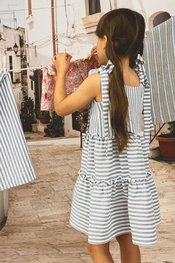Stunning girl twirling dress featuring blue and white stripes. Crafted from organic cotton, this exquisite summer dress is both breathable and lightweight, perfect for active little ones who love to twirl, run, and dance with excitement! The summer girl dress boasts Oeko-Tex certified organic cotton, ensuring it's free from harmful chemicals and gentle on sensitive skin. This eco-friendly choice appeals to families prioritising sustainability and environmental care. Designed with growth in mind, the summer girl dress includes adjustable straps and double-layer twirls, allowing it to adapt as your child grows. The lightweight fabric is a joy to touch and wear, making it an ideal addition to your kids summer clothing.