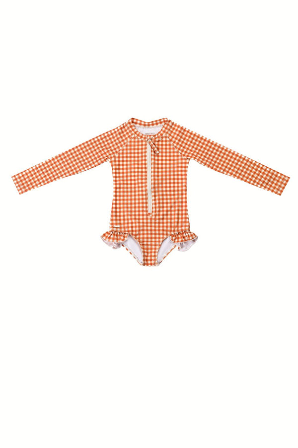 The long sleeve swimsuit with rashguard and ruffle in Sienna Gingham by Grech and Co combines style and functionality. It has long sleeves, a front zipper with a pull tab for easy use, and a zipper pocket for added convenience. Made from GRS-certified recycled fabric and offering UPF 50+ sun protection, this sustainable girls swimsuit for girls keeps your little one safe while playing in the sun. Featuring a ruffled full-coverage bottom, it’s the perfect blend of playful elegance and eco-conscious design for adventurous days at the beach or pool. Explore a sustainable swimwear collection.