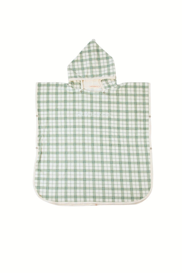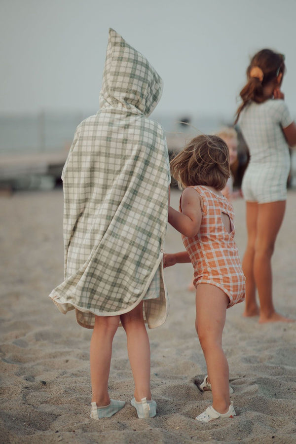 The Grech and Co organic cotton towel poncho in fern green is the perfect blend of comfort, functionality, and sustainable design. Made from soft organic cotton, it features upper and lower side buttons for discreet and convenient changing by the water or for staying warm. A cozy hood with neck buttons provides extra protection on windy beach days, making it an ideal companion for seaside adventures. We love the retro-inspired checkered green and off-white print hooded poncho with the Grech and Co logo embroidered on the front. Thoughtfully crafted for eco-conscious families, this beach poncho is a must-have for timeless summer moments. Explore our kids summer clothing collections!