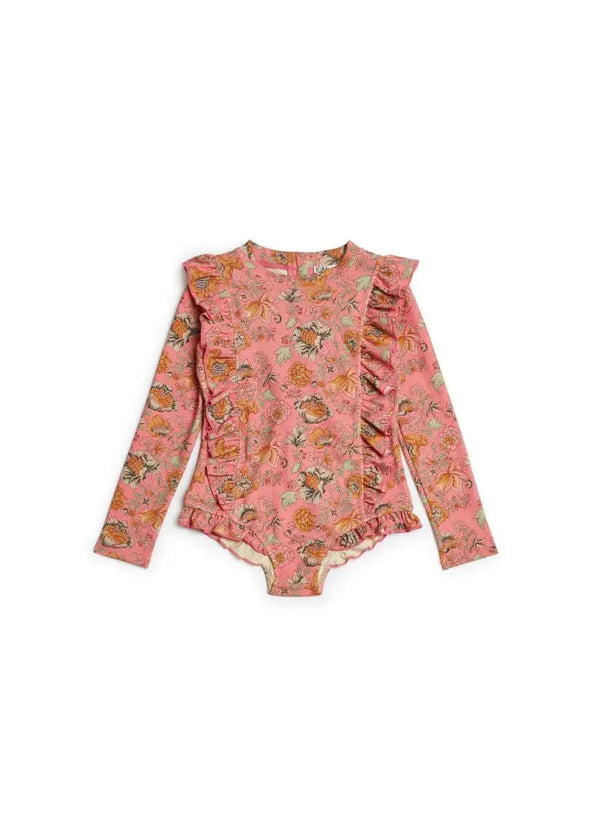 The recycled Aurelia swimsuit in this seasons Bohemian strawberry print is here! Recycled Aurelia Girl's swimsuit is made from an SPF 50 protective fabric covering the entire upper body. It is surf style one-piece swimsuit with ruffles on the front and around the thighs. For easy wear, there is a zipper with a protective cord. It is made with recycled materials and SPF 50 protection in a Bohemian strawberry print by Louise Misha.