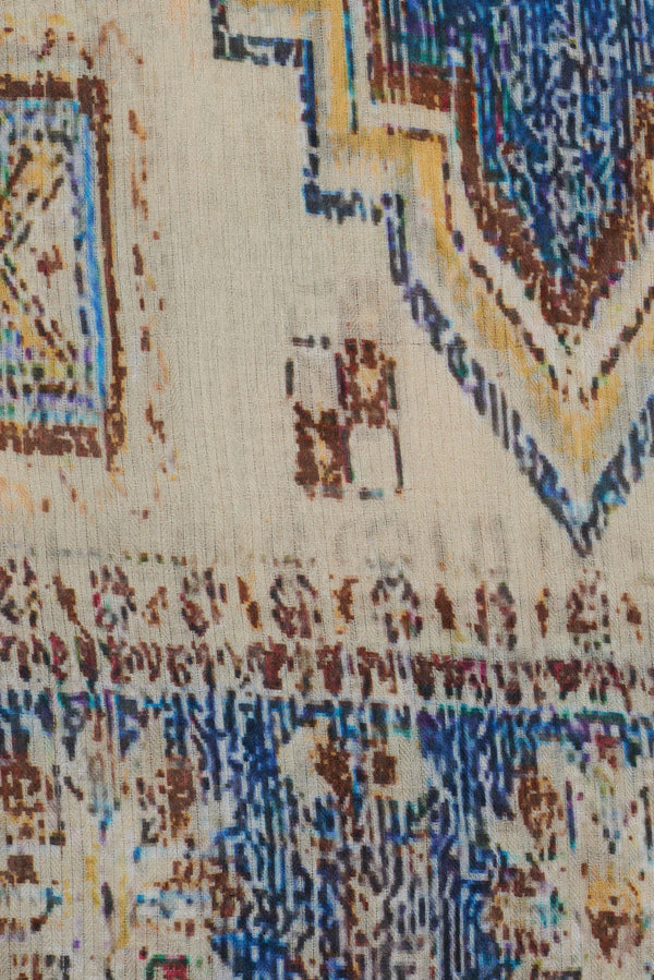 FASHIONED FROM A SOFT BLEND OF COTTON AND MODAL, THE DARINA SCARF FEATURES A BLUE ETHNIC PRINT CONTRASTING AGAINST A BEIGE BACKGROUND. ITS SLIGHTLY FRAYED EDGES ENHANCE ITS BOHEMIAN ALLURE.