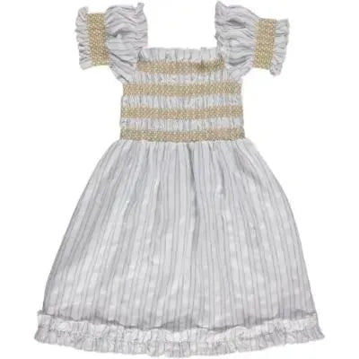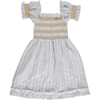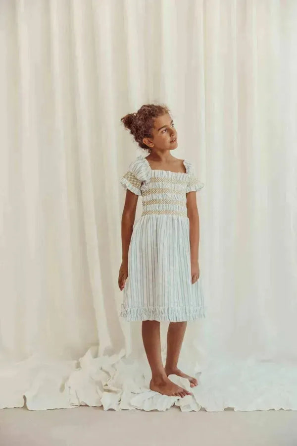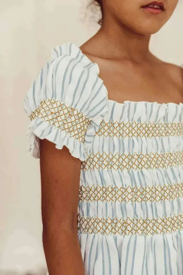 The breathable and lightweight organic cotton Smocked girl's dress has a complete smocked top and wide, loose skirt part with light blue stripes. The short puffed sleeves are smocked together and can also be worn off the shoulder. Each piece has gone through a special washing with unique Liilu science, allergy-friendly.