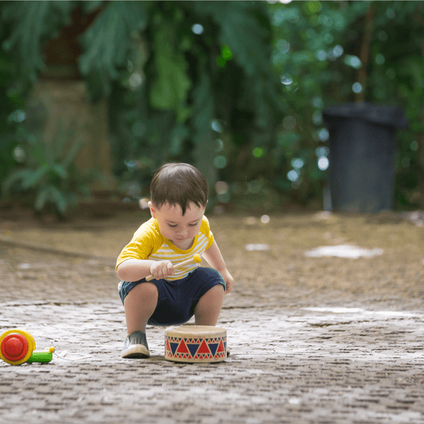 Pretend to be a professional drummer on stage or recruit family members with other musical toys to create a family band! This realistic solid drum has a curved shape and compact size so little ones can easily grasp hold and make music with the toy. A rubberhead drumstick softens beats and sounds. Ethically made from natural rubberwood and stained with non-toxic water-based pigments. Size for toddler and pre-school hands.