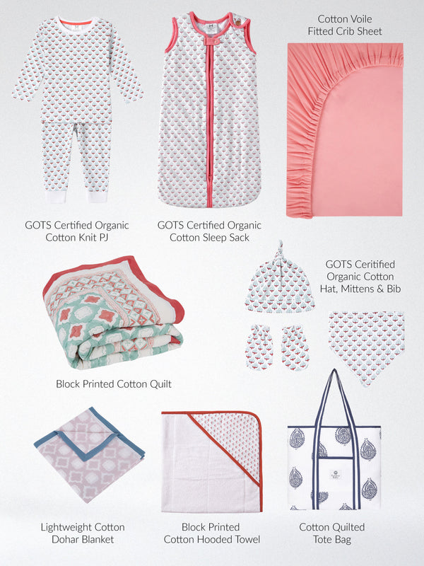 This comprehensive set is thoughtfully curated to provide new parents with everything they need for sleep, bath, and daily essentials - blending practical necessity with timeless Malabar Baby design.