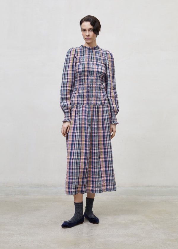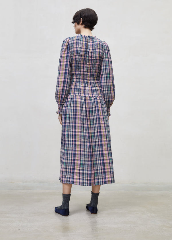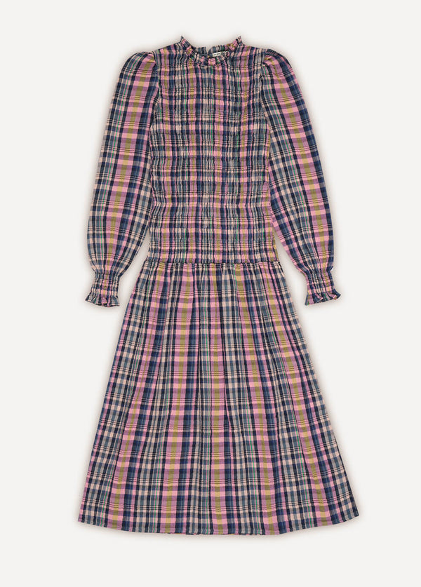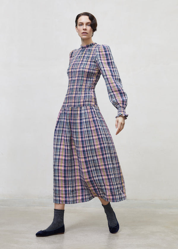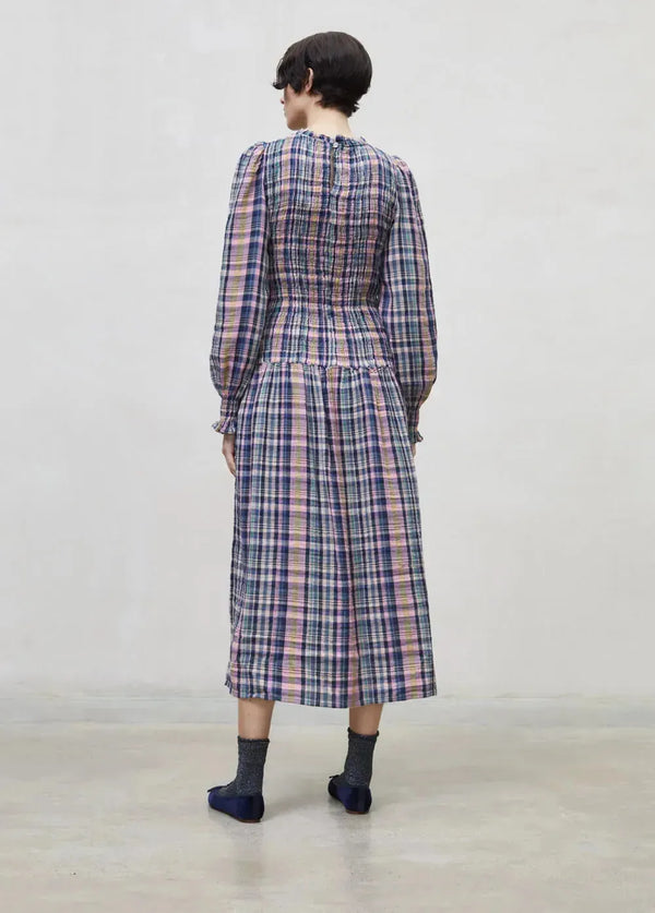 Checked women midi dress in multicolour check and space blue colour is one of the trendiest dresses through the years and the perfect addition to your capsule wardrobe. This checked women's dress has a full body in a smocked panel unit wair and a long midi skirt with a balloon sleeve and smock ruffle in the cuff with an opening at the backside with a dark shell button for closure. This dress is lightweight, very soft and easy to wear and will give you that sophisticated look. Made in cotton double gauze supporting BCI programs in Portugal by The New Society.
